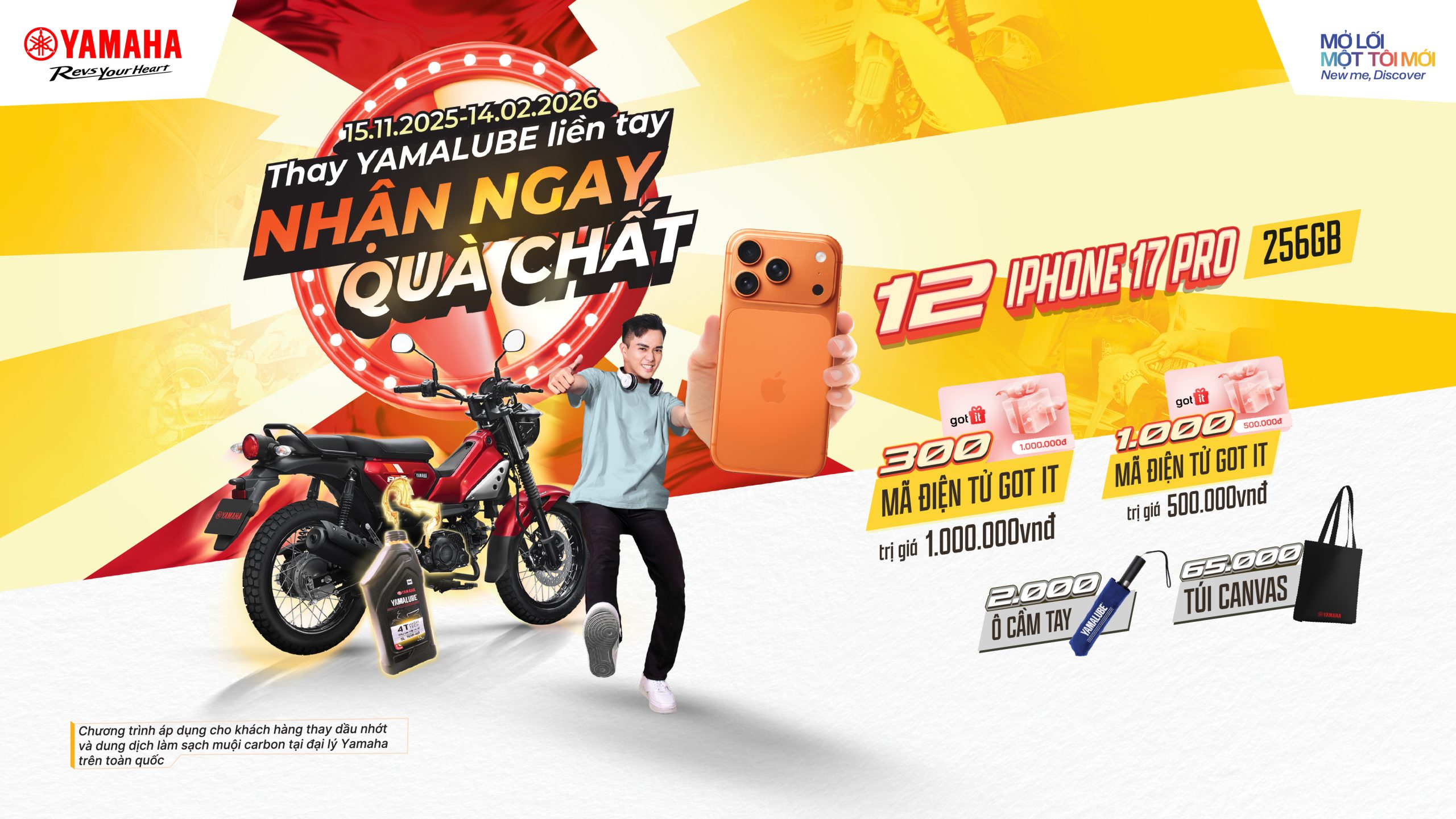 Công ty TNHH Yamaha Motor Việt Nam trân trọng thông báo Chương trình khuyến mại: “THAY YAMAHALUBE LIỀN TAY – NHẬN NGAY QUÀ CHẤT “. Chương trình được áp dụng trên phạm vi toàn quốc từ ngày 15/11/2025 đến ngày 14/02/2026, cụ thể như sau: